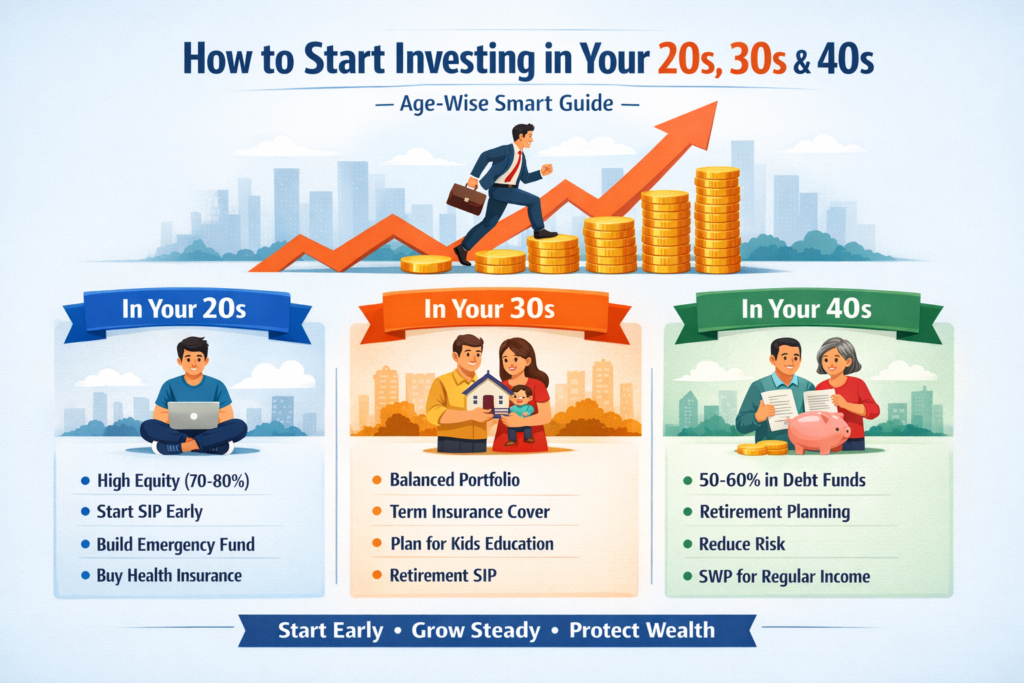 Investing should evolve with your age, income, and responsibilities. In your 20s, focus on building a strong foundation with higher equity exposure, early SIP investments, and an emergency fund. In your 30s, balance growth with stability by securing term insurance, planning for long-term goals, and increasing retirement contributions. In your 40s, shift toward wealth protection, reduce risk gradually, and prepare for retirement with structured planning. Each decade serves a purpose — build, grow, and protect. The key to financial freedom is starting early, staying consistent, and aligning investments with long-term goals.